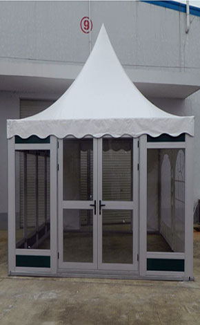 尖頂篷房系列尺寸有3×3米、4×4米,邊高是2.5米,采用二槽的48×84×2.5㎜鋁合金管材做支架。5×5米、6×6和10×10米的尖頂篷房標準邊高是2.5米,用四槽的48×105×3.5㎜鋁合金型材做支架,抗風(fēng)速80公里/小時。