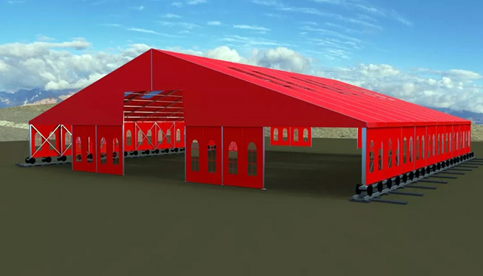 而篷房屬于可拆裝移動建筑,采用高強度鋁合金和防火阻燃篷布建設,整體重量輕,對地面要求非常低,一般只需要場地平整即可,施工無污染,按需求多次移動搭拆,部分異形場地甚至可以做到跟隨山勢等條件搭建,尤其適合工礦企業的復雜作業場地。