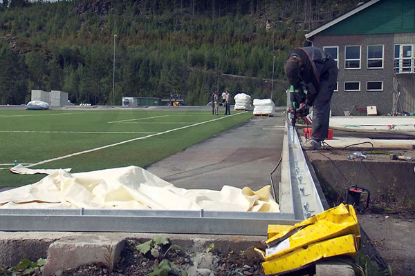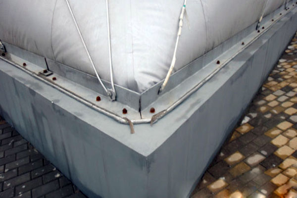 建筑膜體的下沿與基礎梁的連接,用專用的鋼質夾具壓邊,用鏍栓連接到基礎梁中預埋的錨桿上,再將鋼纜穩定(應力控制)系統連接到錨桿上。