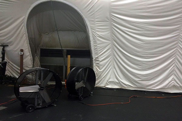 一般配備兩臺主風機,室內(nèi)需要新風時,兩臺風機同時運轉(zhuǎn),保證新風量的供應,滿足室內(nèi)人員呼吸新鮮空氣的需要;室內(nèi)沒有人活動時,只開一臺主風機,提供足夠的內(nèi)外氣壓差,保證氣膜建筑正常工作,同時,為用戶盡量節(jié)省電能。另外配備一臺備用風機,當主風機發(fā)生故障時,啟動備用風機。
