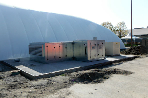 為了保證氣膜建筑全天候地工作,配備一臺功率相匹配的燃油發電機組。當市電停電時,由控制系統(或者人工)啟動。