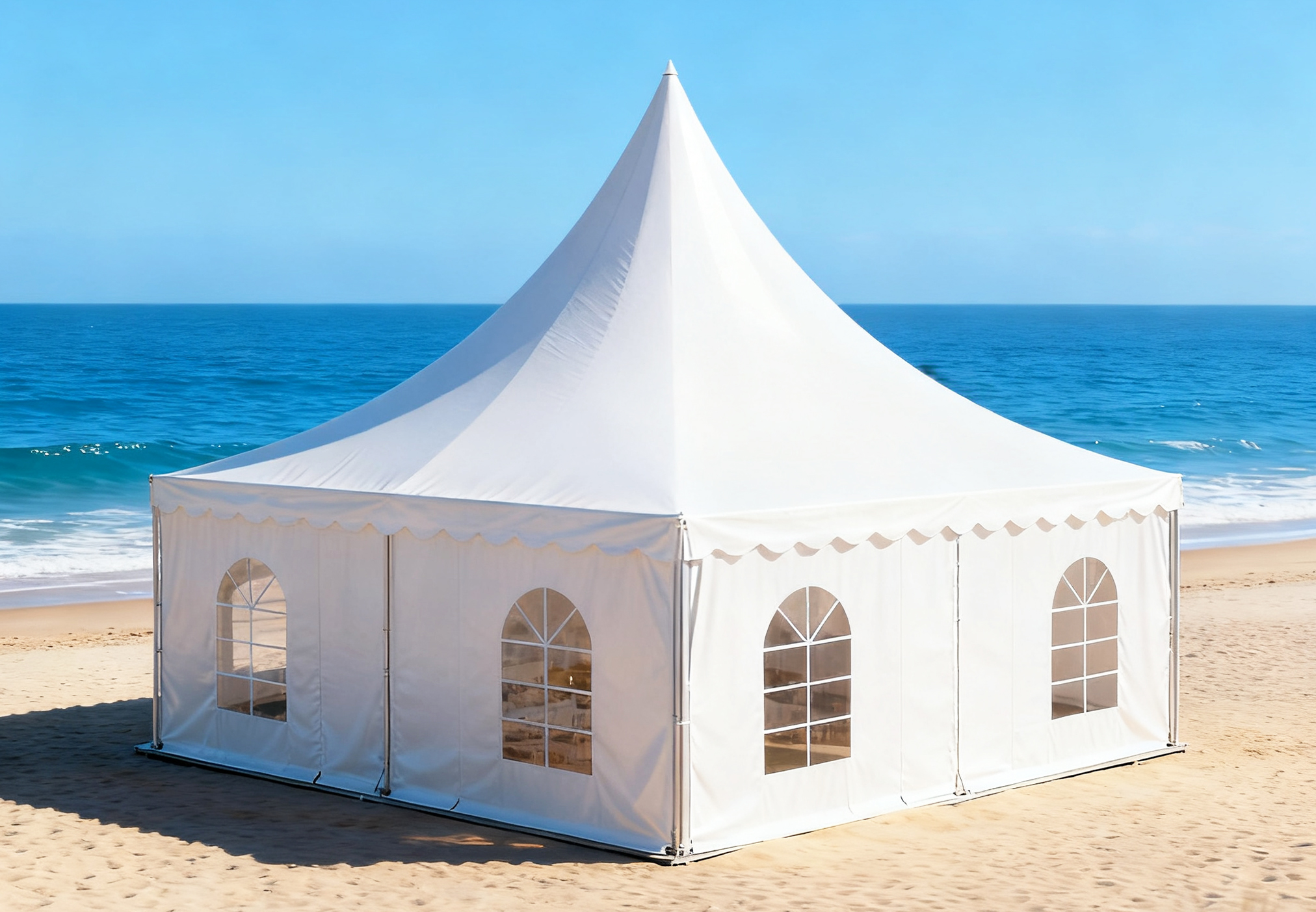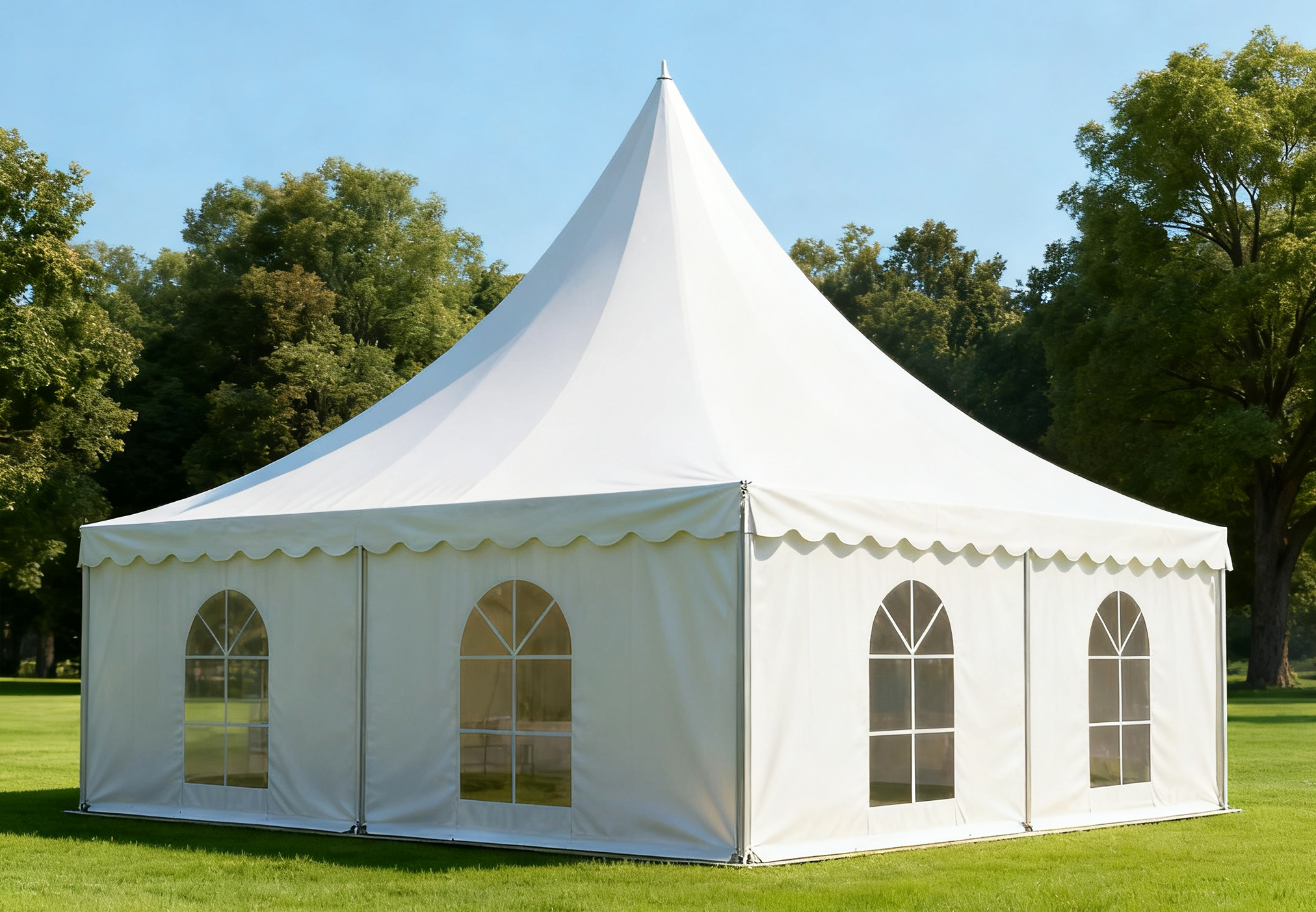 尖頂篷房,又稱寶塔帳篷或錐頂篷房,是一種專為戶外活動設計的臨時建筑。它以獨特的尖頂造型打破了傳統(tǒng)篷房的單調輪廓,棱角分明的立體幾何結構兼具現(xiàn)代藝術感與視覺沖擊力,為各類活動增添獨特格調。