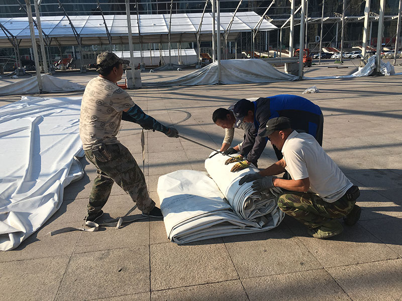 篷房規模大,同樣,吊車規格也要大,高山工人告訴小編,在這過程中絲毫不能松懈,不容許有一丁點的失誤。