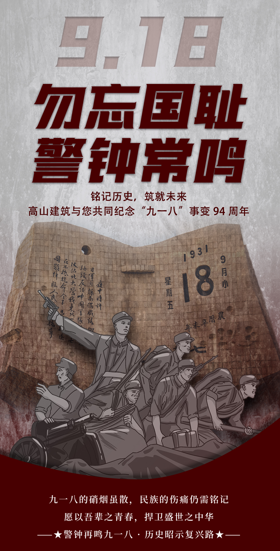九十四年風雨滄桑,“九一八”的警鐘依然長鳴。這一天,是中華民族刻骨銘心的痛楚,也是激勵我們自強不息、奮發圖強的精神源泉。高山篷房建筑科技(遼寧)有限公司在此莊嚴時刻,與全國人民一同緬懷歷史、致敬英烈,勿忘國恥,珍愛和平。
